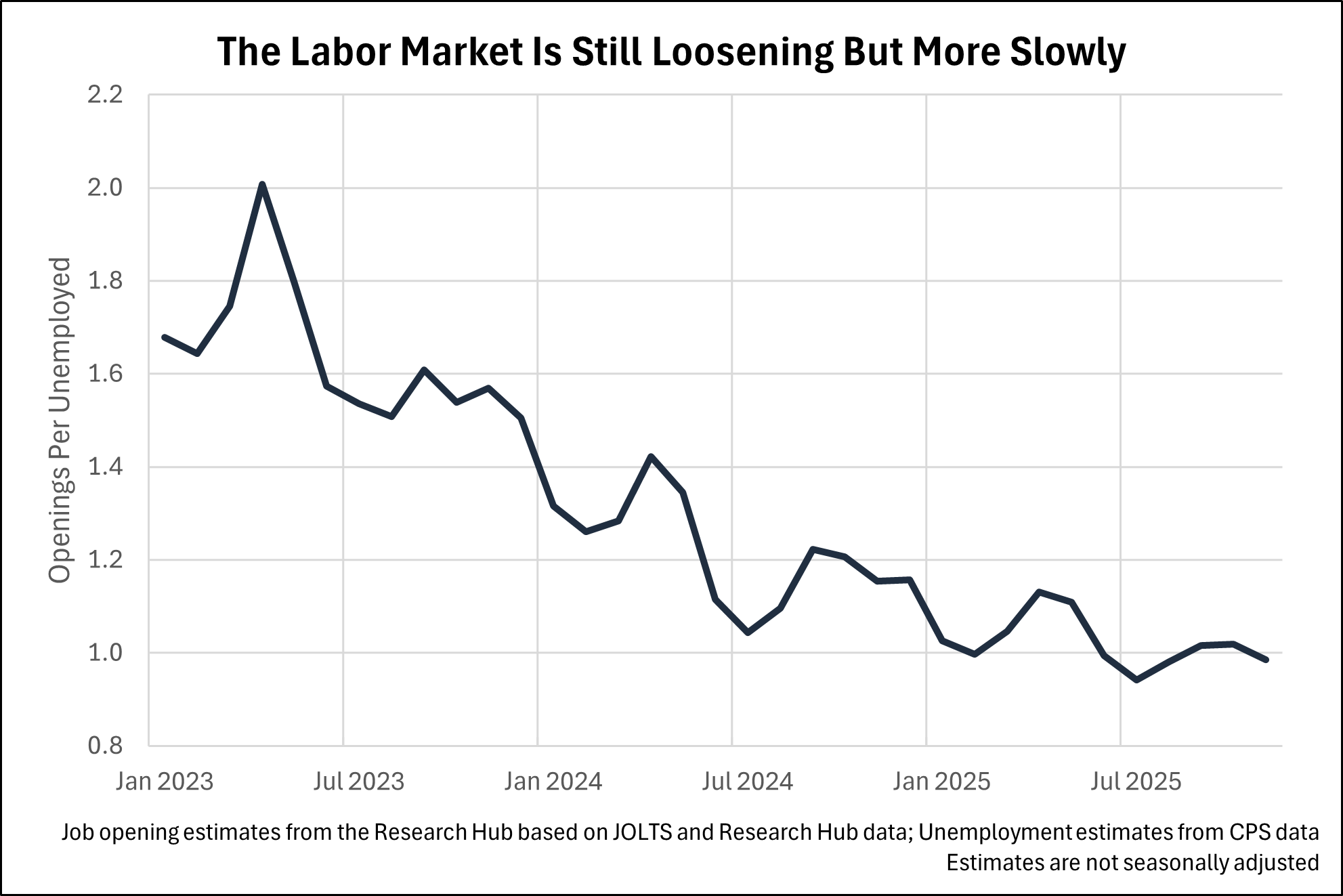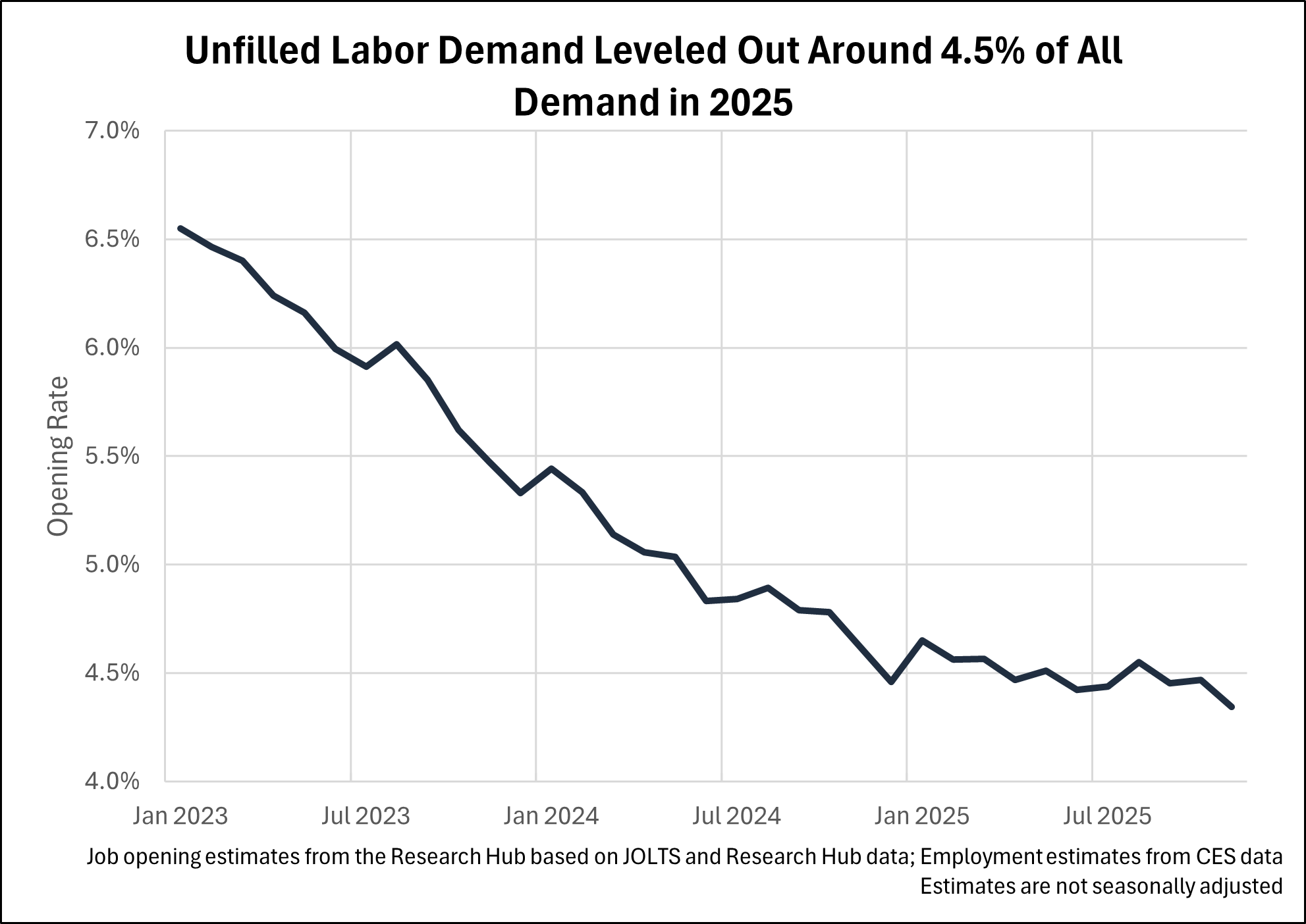 Generally, we can think of labor demand in two parts: demand that is already filled with labor supply (employed workers) and demand that is unfilled (openings). The job opening rate is a commonly used metric that shows job openings as the unfilled portion of labor demand, or unmet demand (calculated as job openings divided by the sum of employment and job openings). In 2025, the job opening rate hovered around 4.5% after declining for the past few years in a trend similar to job openings. However, parallel to job openings, the job opening rate dropped off in November 2025. In other words, the drop in job openings was truly just a drop in unfilled or unmet demand while filled demand (so far) remains mostly the same (filled demand or employment has been pretty stable over the past three years, at least relative to job openings).